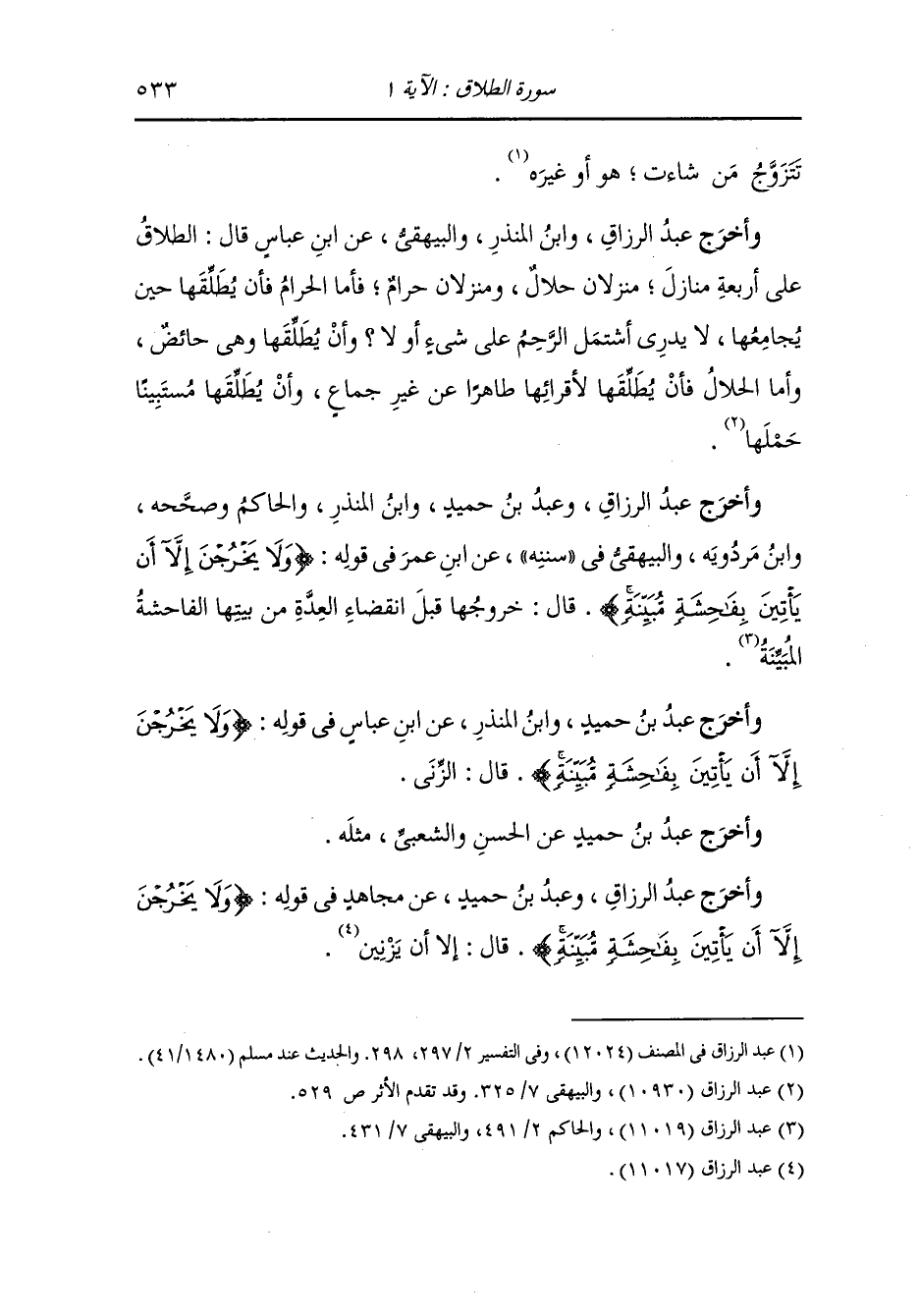 وأخرج عبد الرزاق وسعيد بن منصور ، وَابن راهويه ، وعَبد بن حُمَيد ، وَابن جَرِير ، وَابن مردويه من طرق عن ابن عباس رضي الله عنهما في قوله : {ولا يخرجن إلا أن يأتين بفاحشة مبينة} قال : الفاحشة المبينة أن تبذو المرأة على أهل الرجل فإذا بذت عليهم بلسانها فقد حل لهم إخراجها.