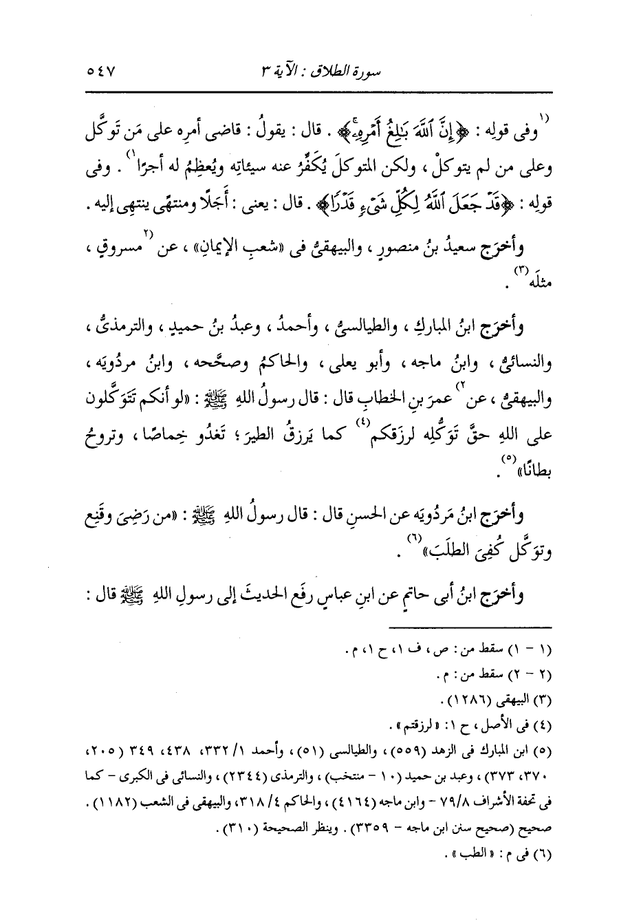 وأخرج أحمد في الزهد عن وهب رضي الله عنه قال : يقول الله تبارك وتعالى : وإذا توكل علي عبدي لو كادته السموات والأرض جعلت له من بين ذلك المخرج.