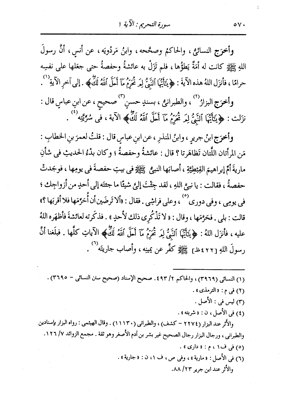 وأخرج ابن مردويه عن ابن عباس رضي الله عنهما قال : وجدت حفصة رضي الله عنها مع النَّبِيّ صلى الله عليه وسلم أم ولده مارية أم إبراهيم فحرم أم ولده لحفصة رضي الله عنها وأمرها أن تكتم ذلك فأسرته إلى عائشة رضي الله عنها فذلك قوله تعالى : {وإذ أسر النَّبِيّ إلى بعض أزواجه حديثا} فأمره الله بكفارة يمينه.