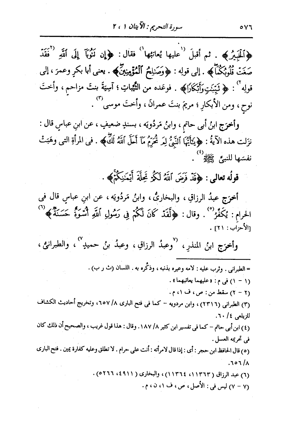 فإن أباك يلي الأمر بعد أبي بكر إذا أنا مت فذهبت حفصة فأخبرت عائشة فقالت عائشة للنبي صلى الله عليه وسلم : من أنبأك هذا قال : نبأني العليم الخبير فقالت عائشة : لا أنظر إليك حتى تحرم مارية فحرمها فأنزل الله {يا أيها النَّبِيّ لم تحرم}.