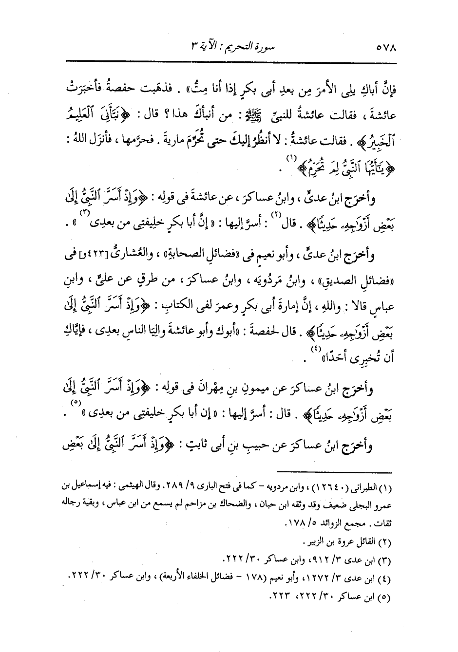 وأخرج عبد الرزاق ، وَابن سعد وأحمد والعدني ، وعَبد بن حُمَيد والبخاري ومسلم والترمذي ، وَابن حبان ، وَابن المنذر ، وَابن مردويه عن ابن عباس رضي الله عنهما قال : لم أزل حريصا أن أسأل عمر رضي الله عنه عن المرأتين من أزواج النَّبِيّ صلى الله عليه وسلم اللتين قال الله تعالى : {إن تتوبا إلى الله فقد صغت قلوبكما} حتى