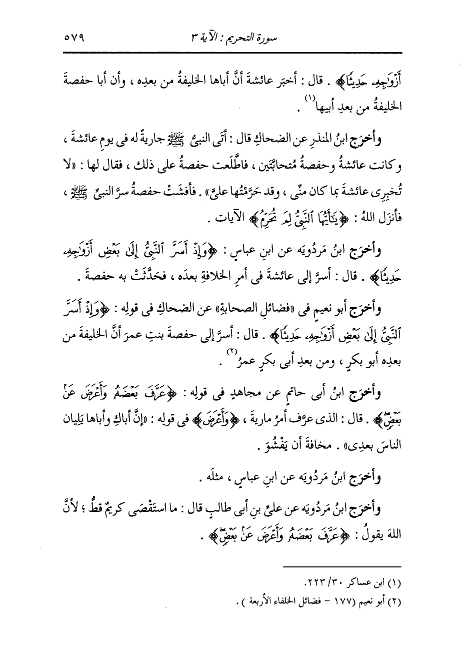 حج عمر وحججت معه فلما كان ببعض الطريق عدل عمر وعدلت معه بالإداوة فتبرز ثم أتى فصببت على يديه فتوضا فقلت : يا أمير المؤمنين من المرأتان من أزواج النَّبِيّ صلى الله عليه وسلم اللتان قال الله : {إن تتوبا إلى الله فقد صغت قلوبكما} فقال : واعجبا لك يا ابن عباس هما عائشة وحفصة ثم أنشأ يحدثني الحديث فقال : كنا معشر قريش نغلب النساء فلما قدمنا المدينة وجدنا قوما تغلبهم نساؤهم فطفق نساؤنا يتعلمن من نسائهم فغضبت على امرأتي يوما فإذا هي تراجعني فأنكرت أن تراجعني فقالت : ما تنكر من ذلك فوالله إن أزواج النَّبِيّ صلى الله عليه وسلم ليراجعنه وتهجره إحداهن اليوم إلى الليل قلت : قد خابت من فعلت ذلك منهن وخسرت قال : وكان منزلي بالعوالي وكان لي جار من الأنصار كنا نتناوب النزول إلى رسول الله صلى الله عليه وسلم فيزل يوما فيأتيني بخبر الوحي وغيره وأنزل يوما فآتيه بمثل ذلك ، قال : وكنا نحدث أن غسان تنعل الخيل لتغزونا فجاء يوما فضرب على الباب فخرجت إليه فقال : حدث أمر عظيم فقلت : أجاءت غسان قال : أعظم من ذلك طلق رسول الله صلى الله عليه وسلم نساءه قلت في نفسي : قد خابت حفصة وخسرت قد كنت أرى ذلك كائنا فلما صلينا الصبح شددت نعلي ثيابي ثم