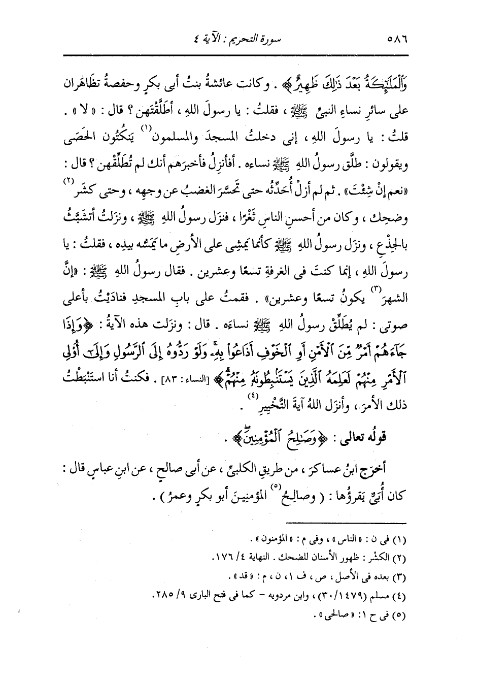 وأخرج عن ابن مسعود عن النَّبِيّ صلى الله عليه وسلم في قول الله : {وصالح المؤمنين} قال : صالح المؤمنين أبو بكر وعمر.