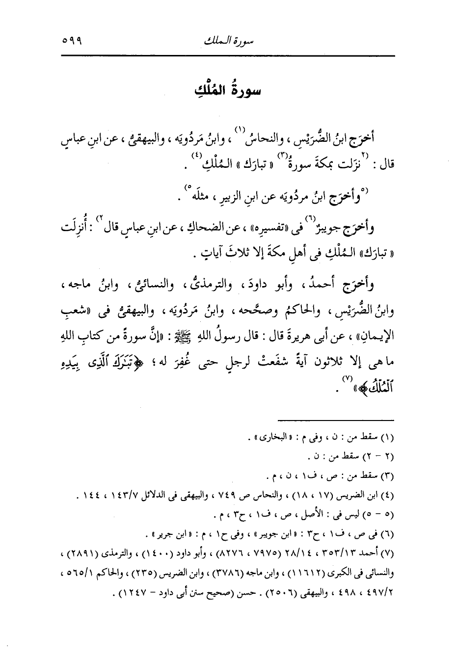 وأخرج عَبد بن حُمَيد في مسنده واللفظ له والطبراني والحاكم ، وَابن مردويه عن ابن عباس أنه قال لرجل : ألا أتحفك بحديث تفرح به قال : بلى قال اقرأ {تبارك الذي بيده الملك} وعلمها أهلك وجميع ولدك وصبيان بيتك وجيرانك فإنها المنجية والمجادلة يوم القيامة عند ربها لقارئها وتطلب له أن تنجيه من عذاب النار وينجو بها صاحبها من عذاب القبر قال : قال رسول الله صلى الله عليه وسلم : لوددت أنها في قلب كل إنسان من أمتي.