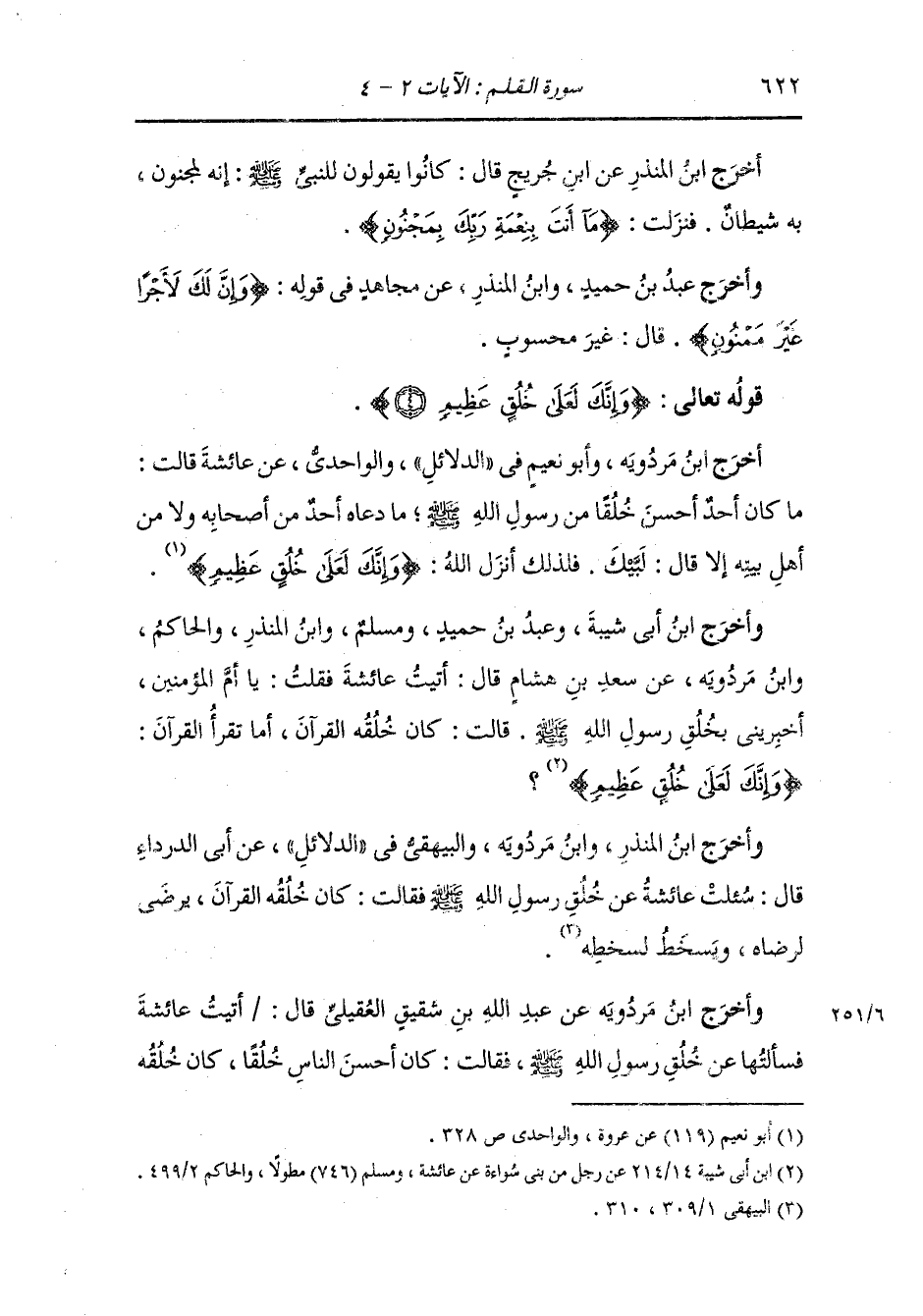 وأخرج عَبد بن حُمَيد عن أبي مالك {وإنك لعلى خلق عظيم} قال : الإسلام ، واخرج عَبد بن حُمَيد عن ابن ابزي وسعيد بن جبير قالا : على دين عظيم.
