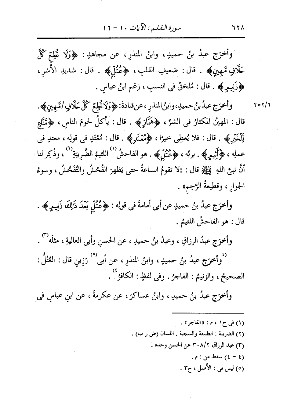 وأخرج عَبد بن حُمَيد عن سعيد بن المسيب في قوله : {عتل بعد ذلك زنيم} قال : هو الملزق في القوم ليس منهم.