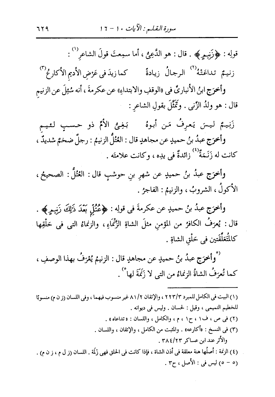 وأخرج ابن أبي شيبة ، وَابن الأنباري في الوقف والإبتداء عن ابن عباس قال : الزنيم الدعي الفاحش اللئيم الملزق ثم أنشد قول الشاعر : زنيم تدعاه الرجال زيادة * كما زيد في عرض اللئيم الأكارع.