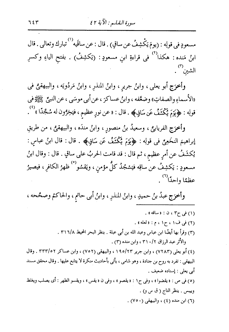 وأخرج البيهقي عن ابن عباس في قوله : {يوم يكشف عن ساق} قال : حين يكشف الأمر وتبدو الأعمال وكشفه دخول الآخرة وكشف الأمر عنه.