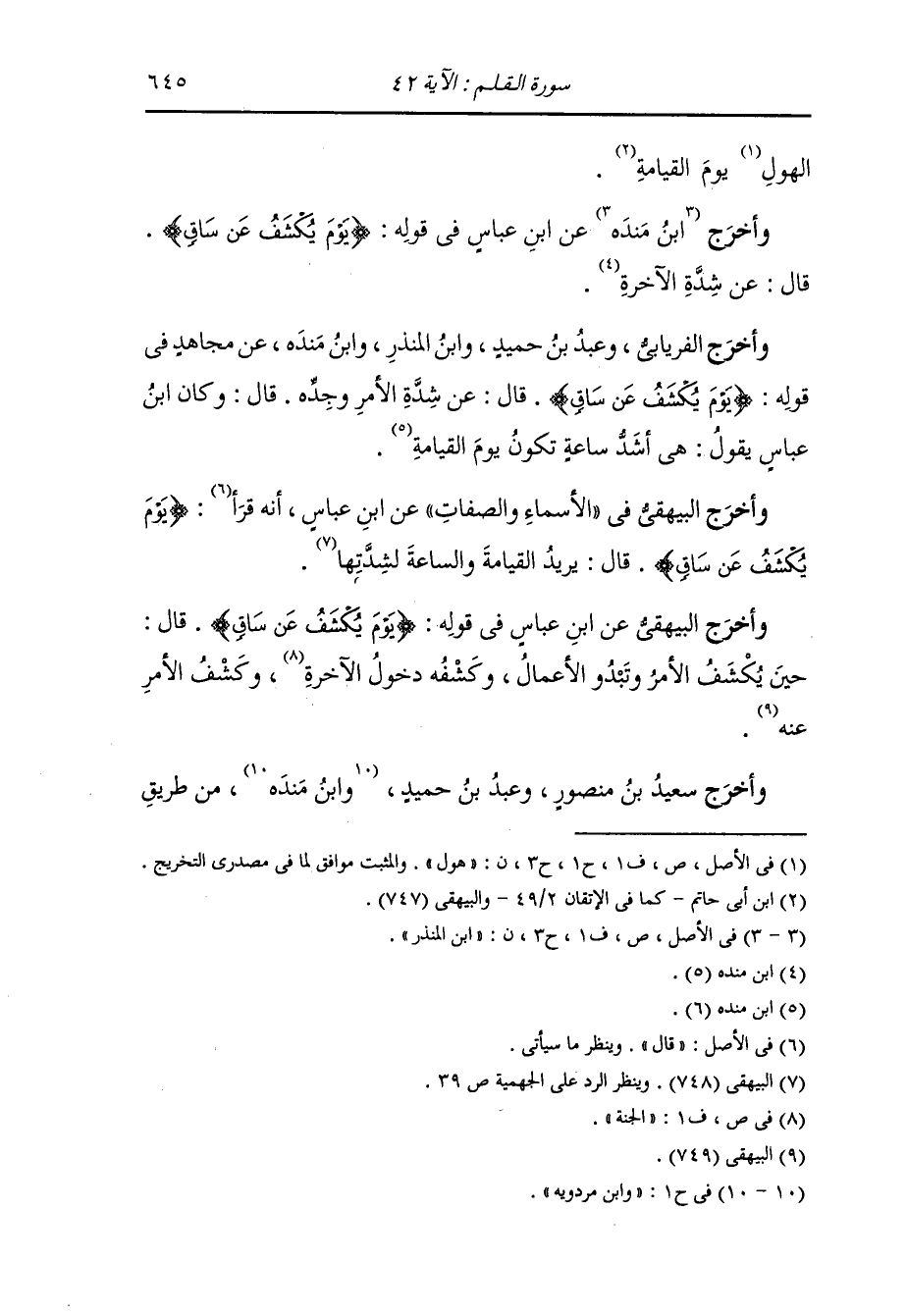 وأخرج عَبد بن حُمَيد ، وَابن المنذر عن سعيد بن جبير أنه سئل عن قوله : (يوم يكشف عن ساق) .فغضب غضبا شديدا وقال :إن أقواما يزعمون أن الله يكشف عن ساقه وإنما يكشف عن الأمر الشديد..