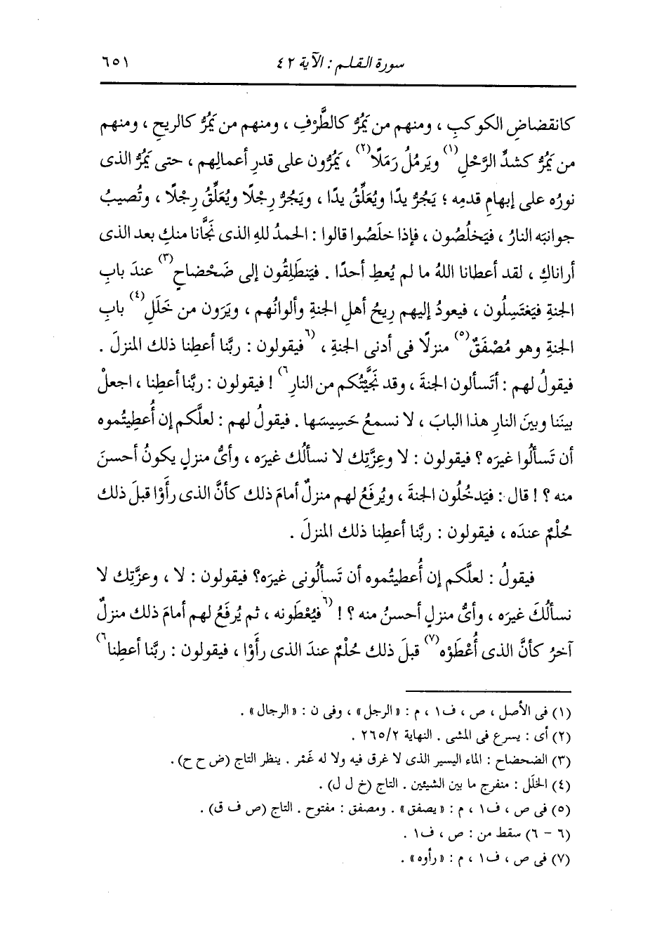 ونصائف وقال : وصائف ، فيدخل فإذا هو بحوراء عيناء عليها سبعون حلة يرى مخ ساقها من وراء حللها كبدها مرآته وكبده مرآتها إذا أعرض عنها إعراضة ازدادت في عينه سبعين ضعفا عما كانت قبل ذلك وإذا أعرضت عنه إعراضة ازداد في عينها سبعين ضعفا عما كان قبل ذلك فتقول : لقد ازددت في عينين سبعين ضعفا ويقول لها مثل ذلك ، قال : فيشرف على ملكه مد بصره مسيرة مائة عام قال : فقال عمر بن الخطاب عند ذلك : ألا تسمع يا كعب ما يحدثنا به ابن أم عبد عن أدنى أهل الجنة ما له فكيف بأعلاهم قال : يا أمير المؤمنين ما لا عين رأت ولا أذن سمعت إن الله كان فوق العرش والماء فخلق لنفسه دارا بيده فزينها بما شاء وجعل فيها ما شاء من الثمرات والشراب ثم أطبقها فلم يرها أحد من خلقه منذ خلقها جبريل ولا غيره من الملائكة ثم قرأ كعب (فلا تعلم نفس ما أخفى لهم من قرة أعين) (سورة السجدة الآية 17) الآية وخلق دون ذلك جنتين فزينهما بما شاء وجعل فيهما ما ذكر من الحرير والسندس والإستبرق وأراهما من شاء من خلقه من الملائكة فمن كان كتابه في عليين نزل تلك الدار فإذا ركب الرجل من أهل عليين في ملكه لم يبق خيمة من خيام الجنة إلا دخلها من ضوء وجهه حتى إنهم ليستنشقون ريحه ويقولون : واها وهذه الريح الطيبة ، ويقولون : لقد أشرف علينا اليوم رجل من أهل عليين ، فقال