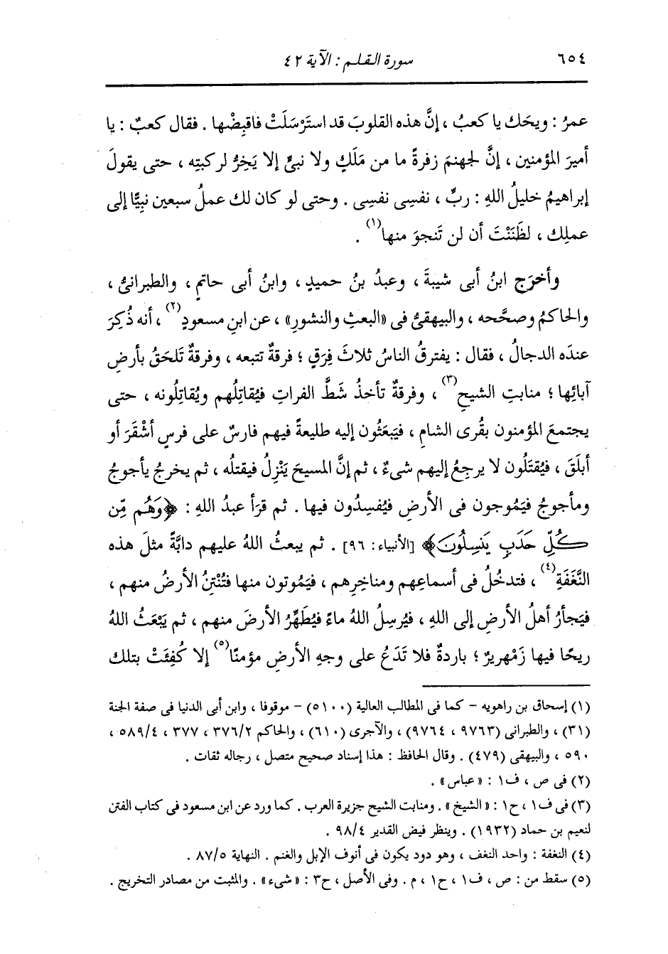 فيقولون : سبحان الله إذا تعرف لنا عرفناه فعند ذلك {يكشف عن ساق} فلا يبقى مؤمن إلا خر لله ساجدا ويبقى المنافقون ظهورهم طبق واحد كأنما فيها السفافيد فيقولون : ربنا فيفول : (قد كنتم تدعون إلى السجود وأنتم سالمون) ثم يؤمر بالصراط فيضرب على جهنم فتمر الناس بأعمالهم يمر أوائلهم كلمح البصر أو كلمح البرق ثم كمر الريح ثم كمر الطير ثم
