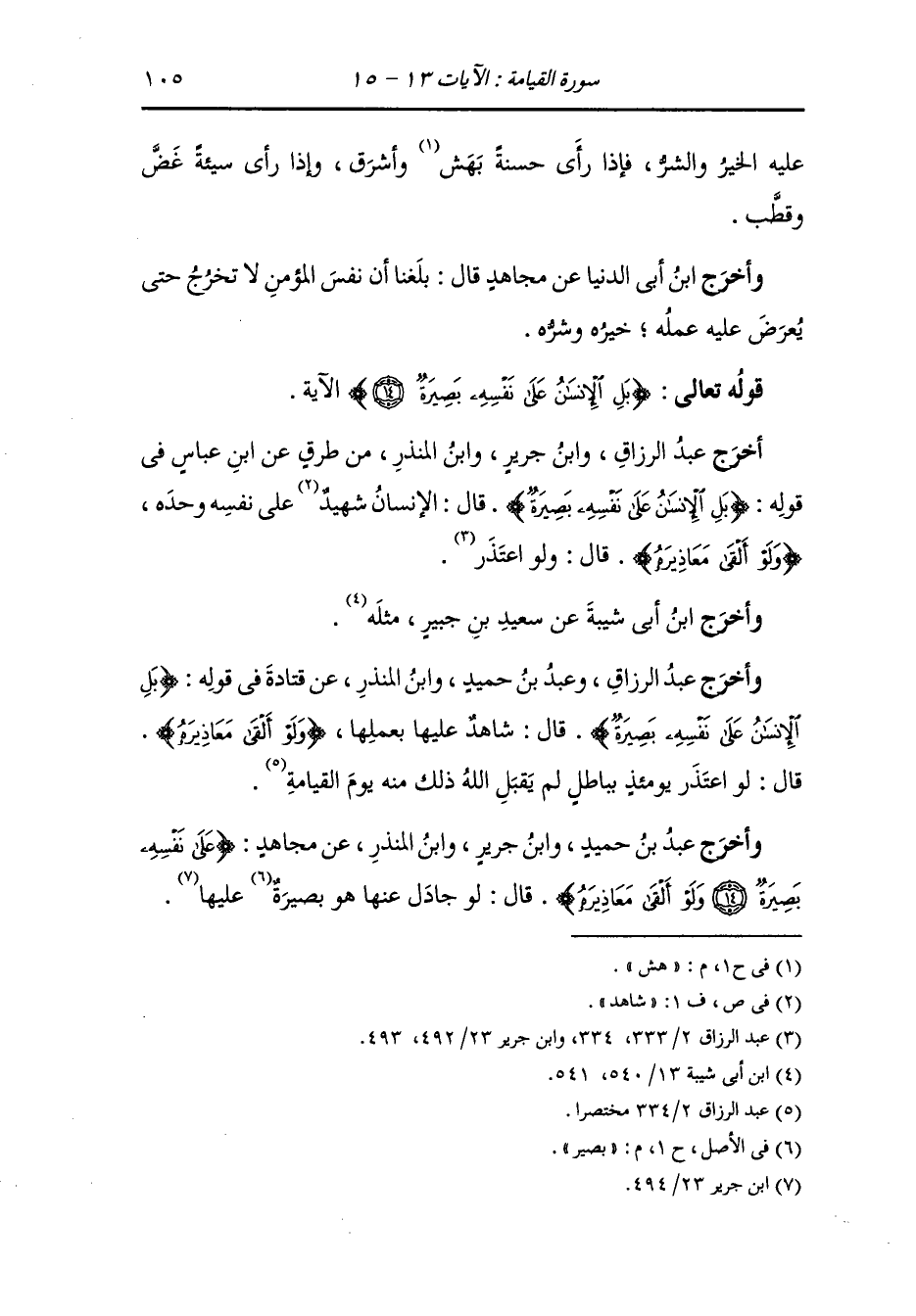 أَخرَج عَبد الرزاق ، وَابن جَرِير ، وَابن المنذر من طريق عن ابن عباس في قوله : {بل الإنسان على نفسه بصيرة} قال : الإنسان شهيد على نفسه وحده {ولو ألقى معاذيره} قال : ولو اعتذر.