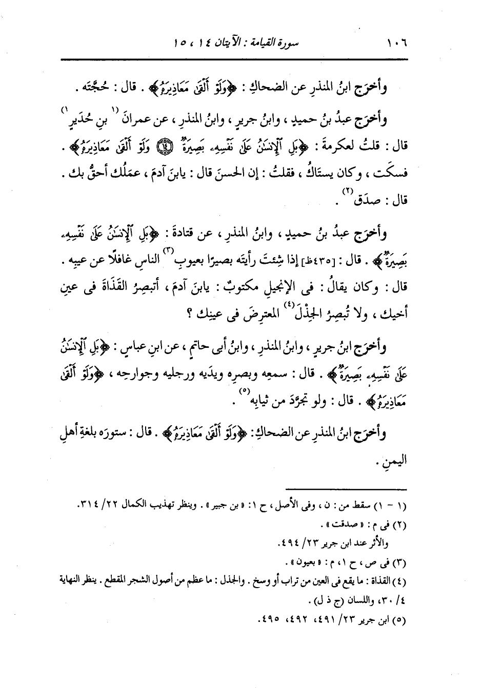 وأخرج عَبد بن حُمَيد ، وَابن جَرِير ، وَابن المنذر عن عمران بن جبير قال : قلت لعكرمة : {بل الإنسان على نفسه بصيرة ولو ألقى معاذيره} فسكت وكان يستاك فقلت : إن الحسن قال : يا ابن آدم عملك أحق بك قال : صدقت.