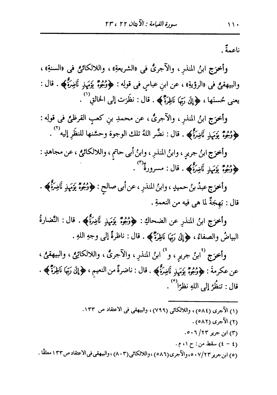 وأخرج ابن المنذر والآجري واللالكائي والبيهقي عن عكرمة {وجوه يومئذ ناضرة} قال : ناضرة من النعيم {إلى ربها ناظرة} قال : تنظر إلى الله نظرا.