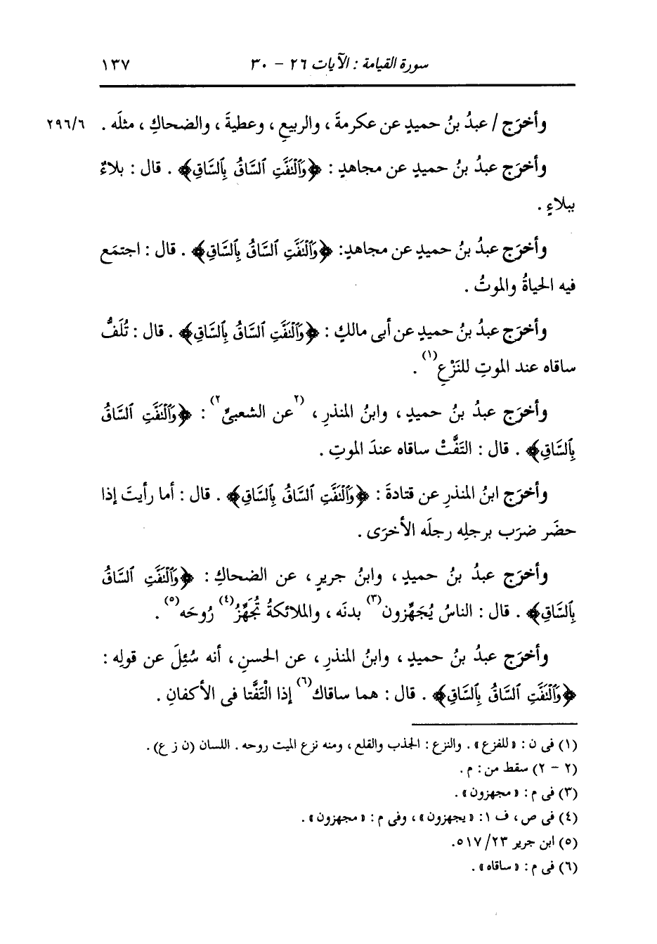 وأخرج عَبد بن حُمَيد ، وَابن المنذر {والتفت الساق بالساق} قال : التفت ساقاه عند الموت.