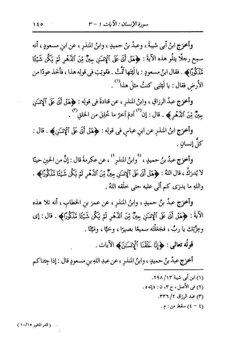 وأخرج ابن أبي شيبة ، وعَبد بن حُمَيد ، وَابن المنذر عن ابن مسعود أنه سمع رجلا يتلو هذه الآية {هل أتى على الإنسان حين من الدهر لم يكن شيئا مذكورا} فقال ابن مسعود : يا ليتها تمت فعوتب في قوله : هذا فأخذ عودا من الأرض فقال : يا ليتني كنت مثل هذا.