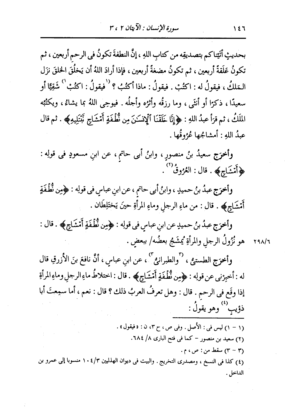 وأخرج عَبد بن حُمَيد ، وَابن أبي حاتم عن ابن عباس في قوله : {من نطفة أمشاج} قال : من ماء الرجل وماء المرأة حين يختلطان.