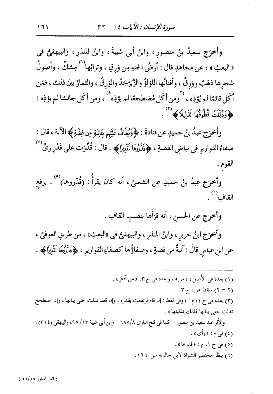 وأخرج عَبد بن حُمَيد عن قتادة {ويطاف عليهم بآنية من فضة} الآية قال : صفاء القوارير في بياض الفضة {قدروها تقديرا} قال : قدرت على قدر رأي القوم.