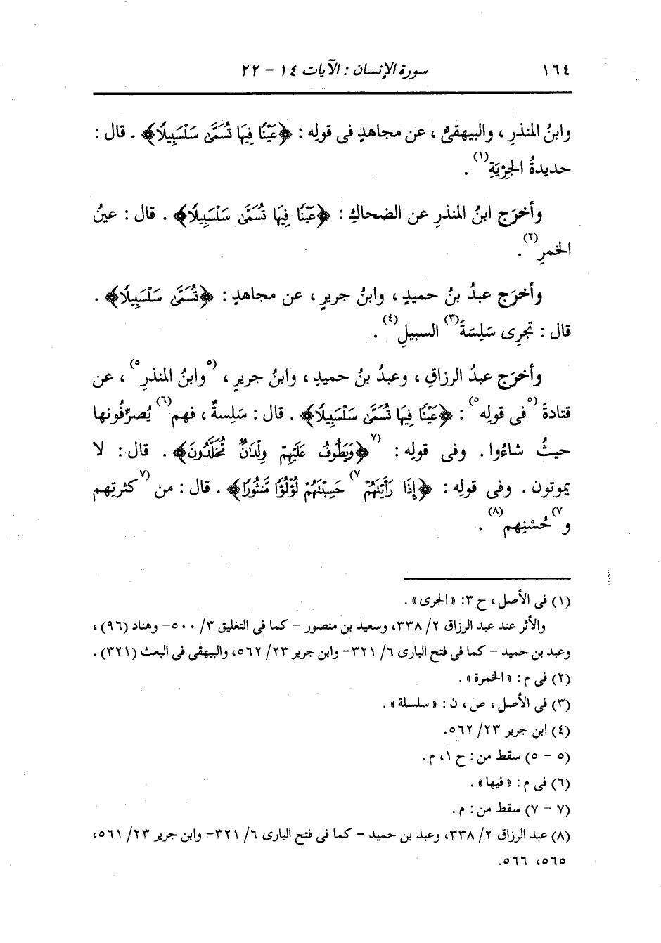 وأخرج عبد الرزاق ، وعَبد بن حُمَيد ، وَابن جَرِير عن قتادة {عينا فيها تسمى سلسبيلا} قال : سلسلة فيها يصرفونا حيث شاؤوا وفي قوله : {حسبتهم لؤلؤا منثورا} قال : من حسنهم.