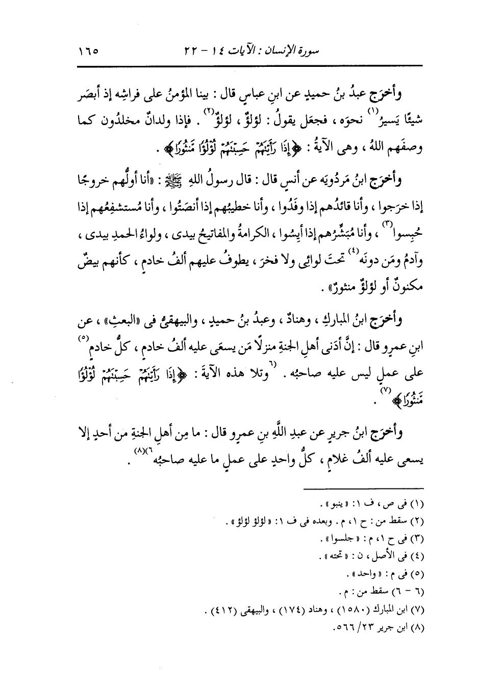وأخرج عَبد بن حُمَيد عن ابن عباس قال : بينا المؤمن على فراشه إذ أبصر شيئا يسير نحوه فجعل يقول : لؤلؤ فإذا ولدان مخلدون كما وصفهم الله وهي الآية {إذا رأيتهم حسبتهم لؤلؤا منثورا}.