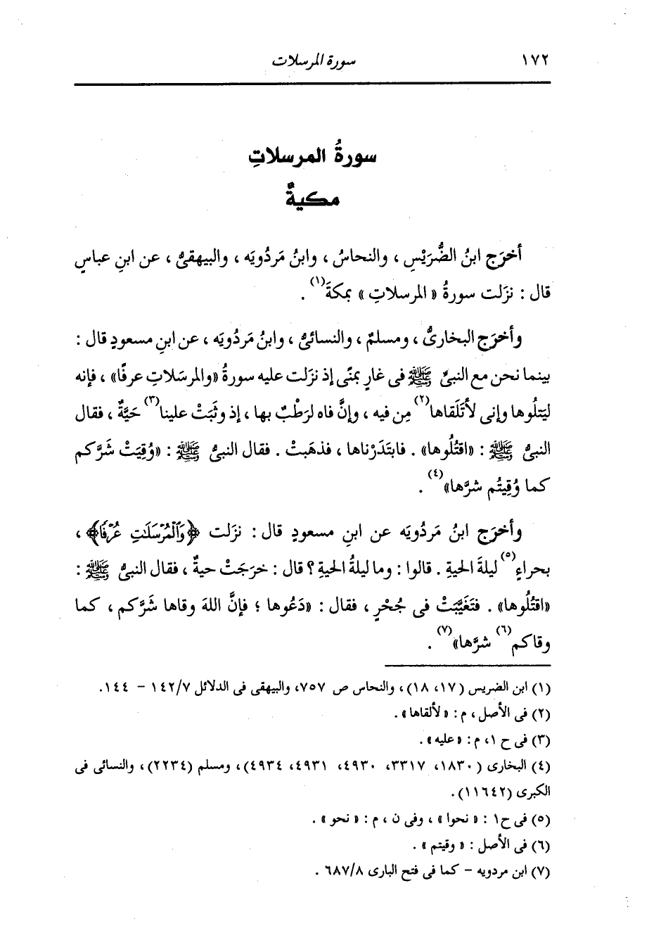 وأخرج البخاري ومسلم والنسائي ، وَابن مردويه عن ابن مسعود رضي الله عنه قال : بينما نحن مع النَّبِيّ صلى الله عليه وسلم في غار بمنى إذ نزلت عليه سورة والمرسلات عرفا فإنه يتلوها وإني لألقاها من فيه وإن فاه لرطب بها إذا وثبت عليه حية فقال النَّبِيّ صلى الله عليه وسلم : اقتلوها فابتدرناها فذهبت ، فقال النَّبِيّ صلى الله عليه وسلم : وقيت شركم كما وقيتم شرها.