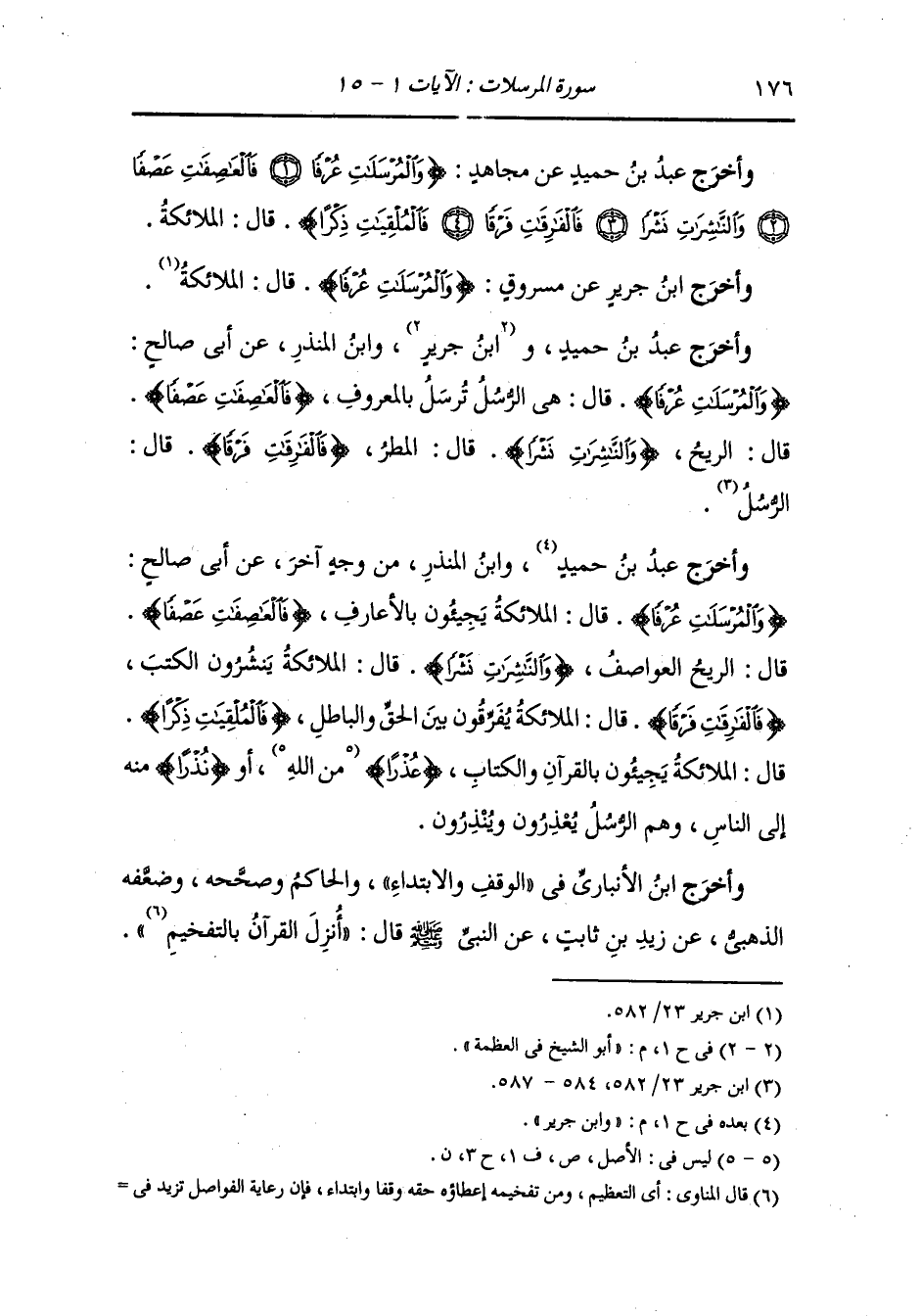 وأخرج عَبد بن حُمَيد عن مجاهد {والمرسلات عرفا فالعاصفات عصفا والناشرات نشرا فالفارقات فرقا فالملقيات ذكرا} قال : الملائكة.