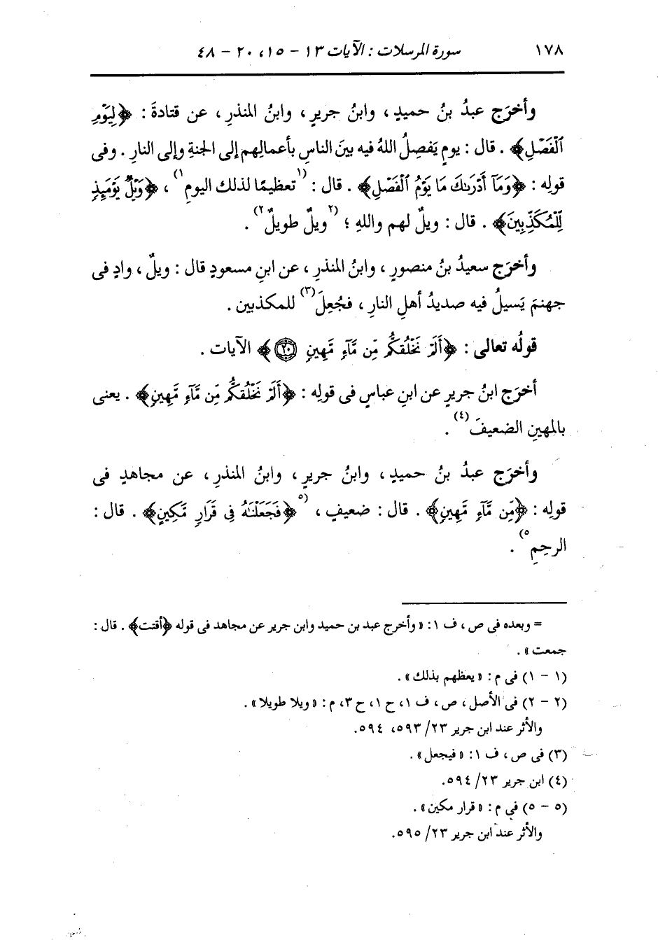 وأخرج عَبد بن حُمَيد ، وَابن جَرِير ، وَابن المنذر عن قتادة {ليوم الفصل} قال : يوم يفصل الله فيه بين الناس بأعمالهم إلى الجنة وإلى النار {وما أدراك ما يوم الفصل} قال : يعظهم بذلك {ويل يومئذ للمكذبين} قال : ويل لهم والله ويلا طويلا.