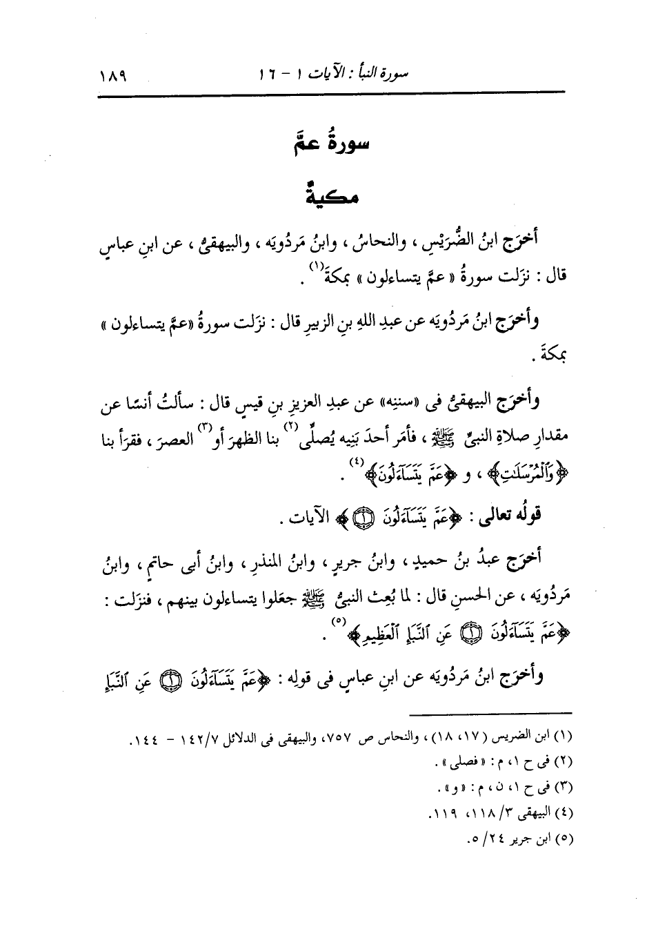 أَخْرَج ابن الضريس والنحاس ، وَابن مردويه والبيهقي عن ابن عباس قال : نزلت سورة {عم يتساءلون} بمكة.