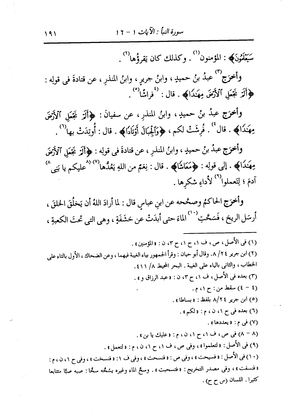 وأخرج عَبد بن حُمَيد ، وَابن المنذر عن قتادة في قوله : {ألم نجعل الأرض مهادا} إلى قوله : {معاشا} قال : نعم من الله يعددها عليك يا ابن آدم لتعمل لأداء شكرها.