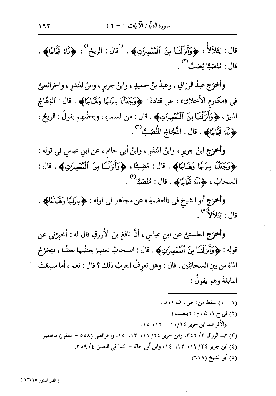 وأخرج عبد الرزاق ، وعَبد بن حُمَيد ، وَابن جَرِير ، وَابن المنذر والخرائطي في مكارم الأخلاق عن قتادة {وجعلنا سراجا وهاجا} قال : الوهاج المنير {وأنزلنا من المعصرات} قال : من السماء وبعضهم يقول من الريح {ماء ثجاجا} قال : الثجاج المنصب.