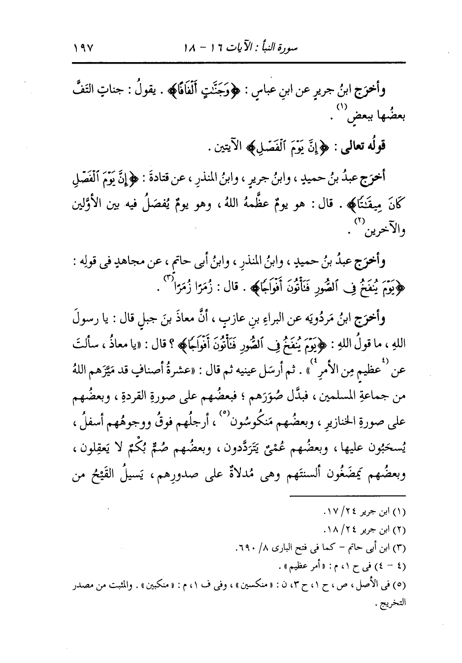 وأخرج ابن مردويه عن البراء بن عازب : إن معاذا بن جبل قال : يا رسول الله ما قول الله {يوم ينفخ في الصور فتأتون أفواجا} فقال : يا معاذ سألت عن أمر عظيم ثم أرسل عينيه ثم قال : عشرة أصناف قد ميزهم الله من جماعة المسلمين وبدل صورهم فبعضهم على صورة القردة وبعضهم على صورة الخنازير وبعضهم منكبين أرجلهم فوق وجوههم أسفل يسحبون عليها وبعضهم عمي يترددون وبعضهم صم بكم لا يعقلون وبعضهم يمضغون ألسنتهم وهي مدلاة على صدورهم يسيل القيح من