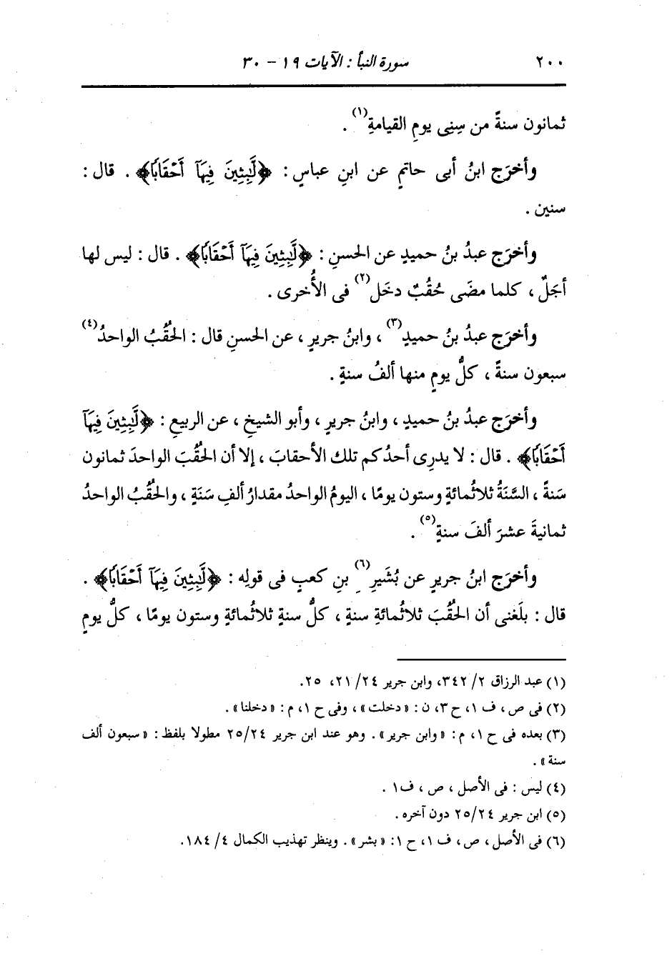 وأخرج ابن جرير عن بشير بن كعب في قوله : {لابثين فيها أحقابا} قال : بلغني أن الحقب ثلاثمائة سنة كل سنة ثلاثمائة وستون يوما كل يوم
