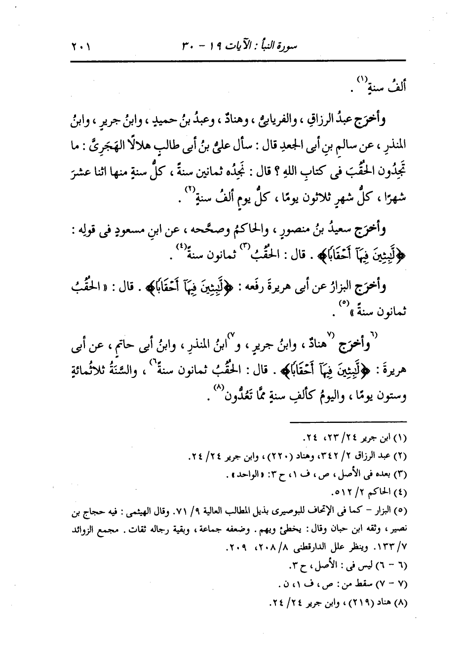 وأخرج عبد الرزاق والفريابي وهناد ، وعَبد بن حُمَيد ، وَابن جَرِير ، وَابن المنذر عن سالم بن أبي الجعد قال : سأل علي بن أبي طالب هلالا الهجري : ما تجدون الحقب في كتاب الله قال : نجده ثمانين سنة كل سنة منها اثنا عشر شهرا كل شهر ثلاثون يوما كل يوم ألف سنة.