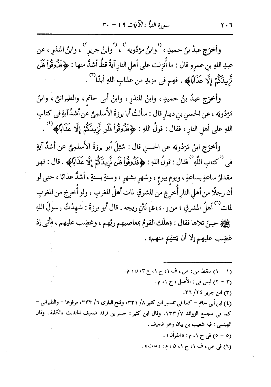 وأخرج عَبد بن حُمَيد ، وَابن المنذر ، وَابن أبي حاتم والطبراني ، وَابن مردويه عن الحسن بن دينار قال : سألت أبا برزة الأسلمي عن أشد آية في كتاب الله على أهل النار فقال : قول الله {فذوقوا فلن نزيدكم إلا عذابا}.