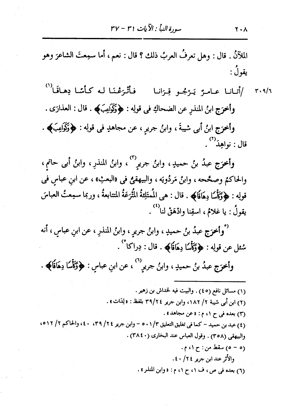 وأخرج عَبد بن حُمَيد ، وَابن جَرِير ، وَابن المنذر عن ابن عباس {وكأسا دهاقا}