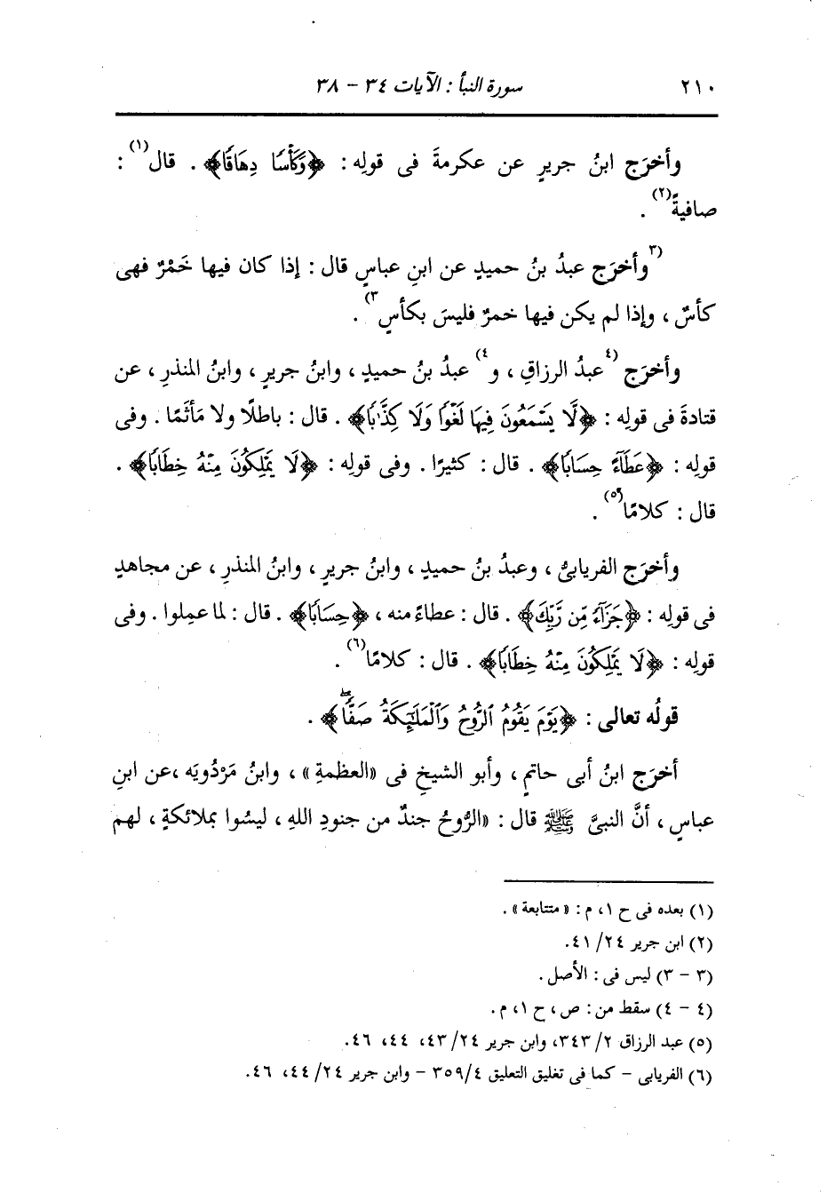 وأخرج عَبد بن حُمَيد ، وَابن جَرِير ، وَابن المنذر عن قتادة في قوله : {لا يسمعون فيها لغوا ولا كذابا} قال : باطلا ولا مأثما وفي قوله : {عطاء حسابا} قال : كثيرا وفي قوله : {لا يملكون منه خطابا} قال : كلاما.