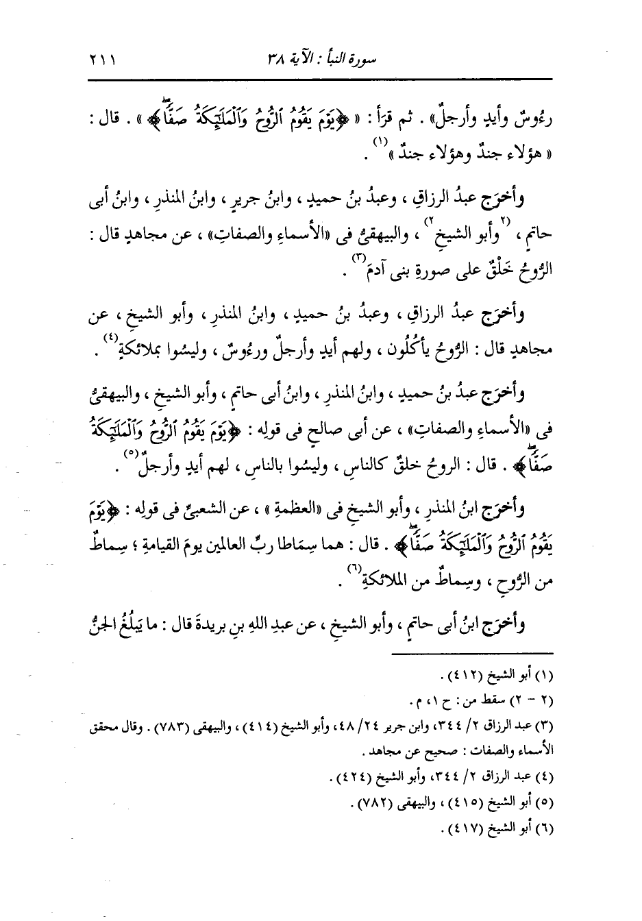 وأخرج عَبد بن حُمَيد ، وَابن المنذر ، وَابن أبي حاتم وأبو الشيخ والبيهقي في الأسماء والصفات عن أبي صالح في قوله : {يوم يقوم الروح والملائكة صفا} قال : الروح خلق كالناس وليسو بالناس لهم أيد وأرجل.
