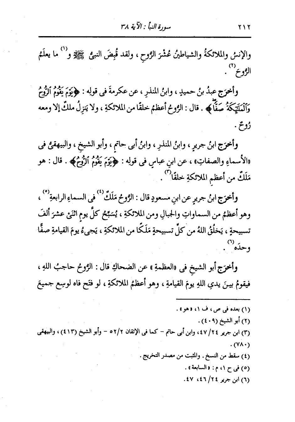 وأخرج ابن جرير ، وَابن المنذر ، وَابن أبي حاتم وأبو الشيخ والبيهقي في الأسماء والصفات عن ابن عباس في قوله : {يوم يقوم الروح} قال : هو ملك من أعظم الملائكة خلقا.