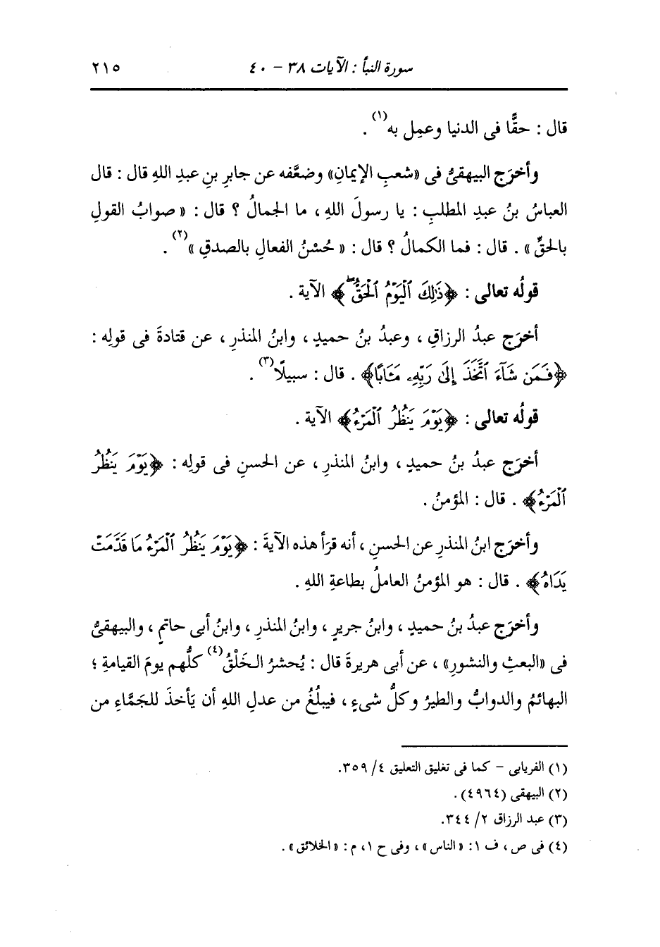 وأخرج البيهقي في شعب الإيمان وضعفه ، عَن جَابر بن عبد الله قال : قال العباس بن عبد المطلب يا رسول الله : ما الجمال قال : صواب القول بالحق ، قال : فما الكمال قال : حسن الفعال بالصدق والله أعلم.