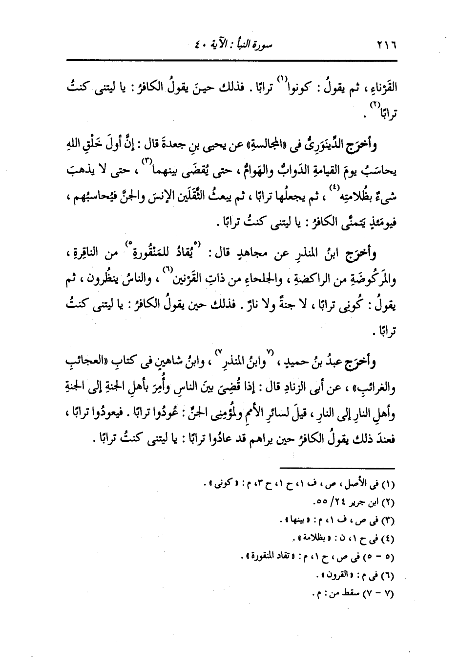 وأخرج عَبد بن حُمَيد ، وَابن شاهين في كتاب العجائب الغرائب عن أبي الزناد قال : إذا قضى بين الناس وأمر بأهل الجنة إلى الجنة وأهل النار إلى النار قيل لسائر الأمم ولمؤمني الجن عودوا ترابا فيعودوا ترابا فعند ذلك يقول الكافر حين يراهم قد عادوا ترابا : {يا ليتني كنت ترابا}.