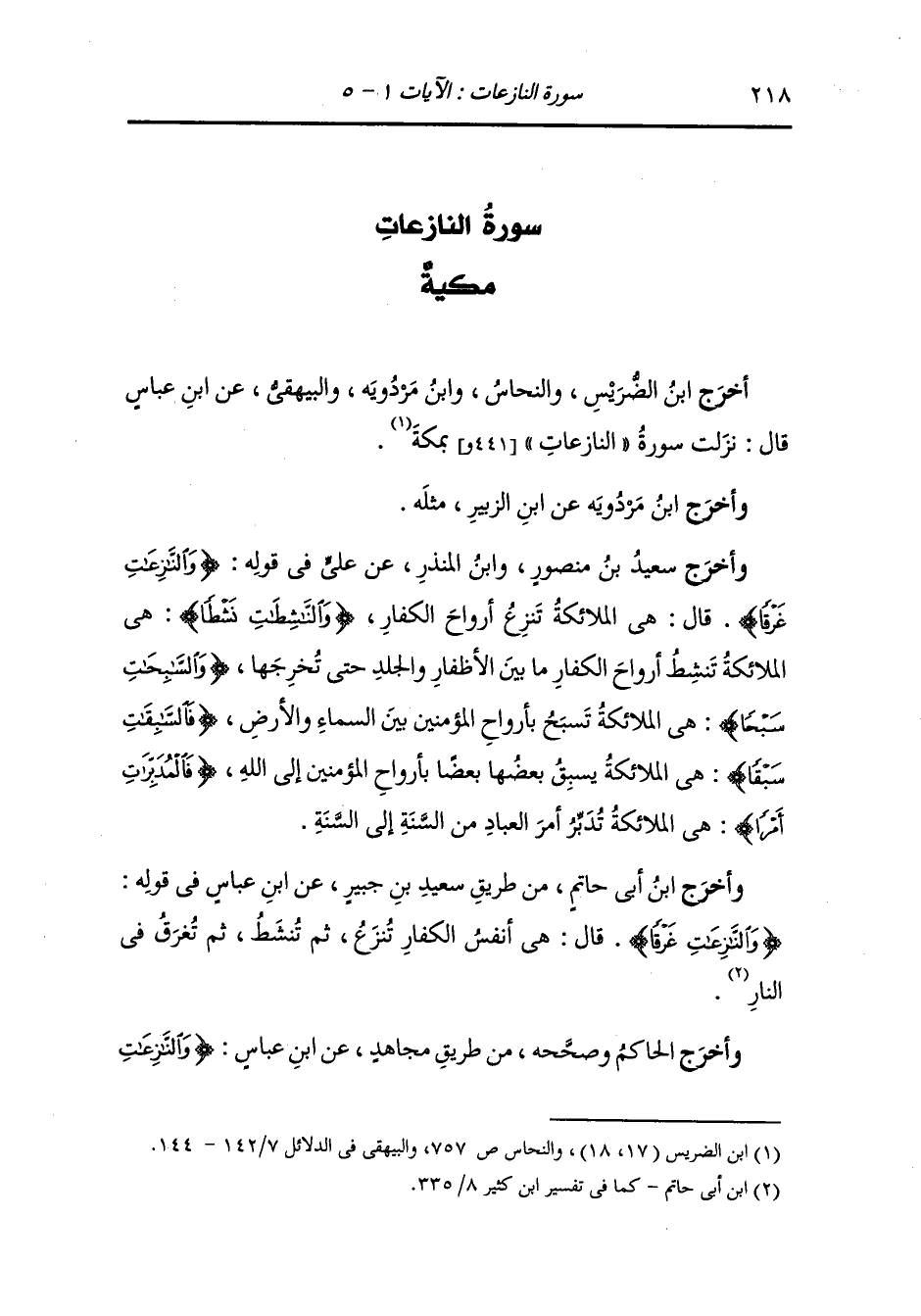 أَخْرَج ابن الضريس والنحاس ، وَابن مردويه والبيهقي عن ابن عباس قال : نزلت سورة النازعات بمكة.