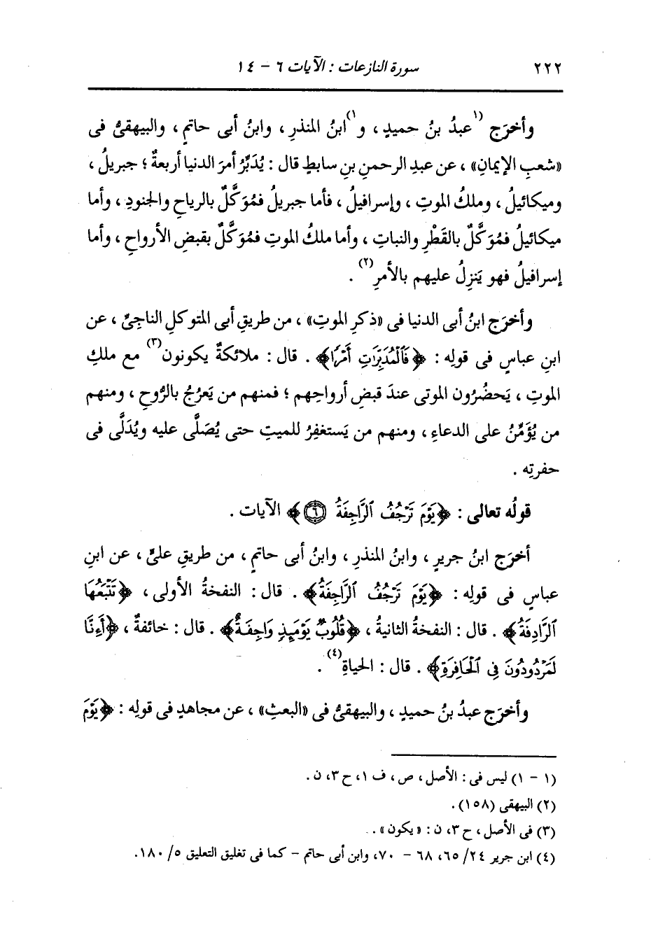 وأخرج عَبد بن حُمَيد ، وَابن المنذر ، وَابن أبي حاتم والبيهقي في شعب الإيمان عن عبد الرحمن بن سابط قال : يدبر أمر الدنيا أربعة جبريل وميكائيل وملك الموت وإسرائيل فإما جبريل فموكل بالرياح والجنود وأما ميكائل فموكل بالقطر والنبات وأما ملك الموت فموكل بقبض الأرواح وأما إسرافيل فهو ينزل عليهم بالأمر.