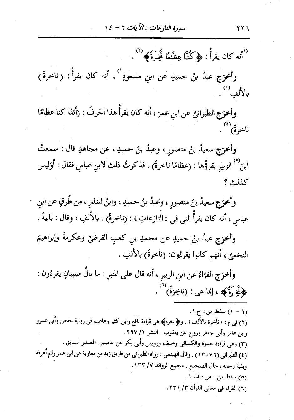 وَأخرَج سعيد بن منصور ، وعَبد بن حُمَيد ، وَابن المنذر من طرق ابن عباس أنه كان يقرأ التي في النازعات ناخرة بالألف وقال : بالية.