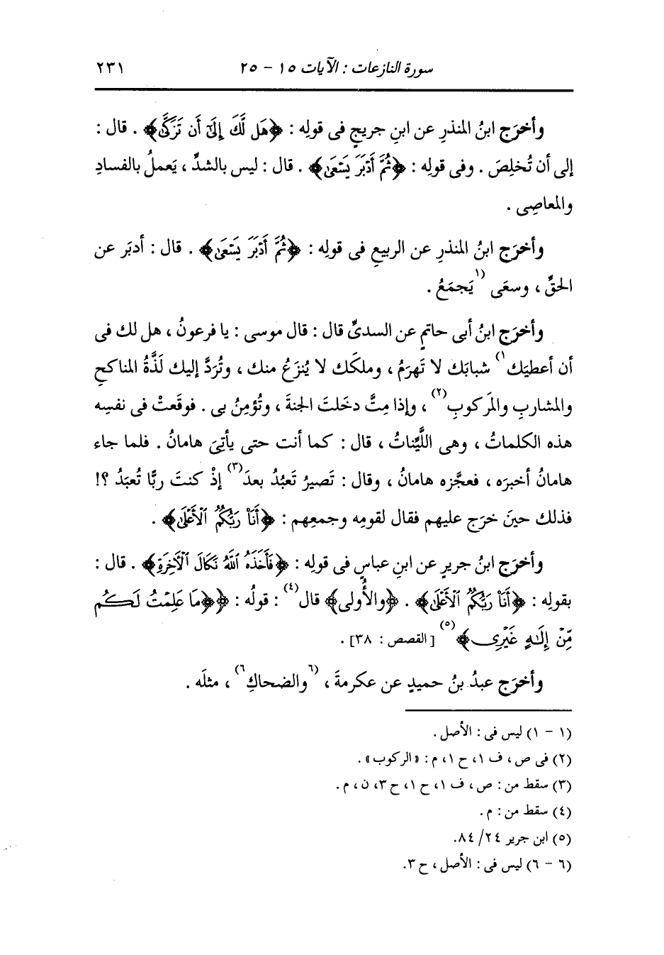 وأخرج ابن المنذر عن ابن جريج في قوله : {هل لك إلى أن تزكى} قال : إلى أن تخلص وفي قوله : {ثم أدبر يسعى} قال : ليس بالشد يعمل بالفساد والمعاصي.