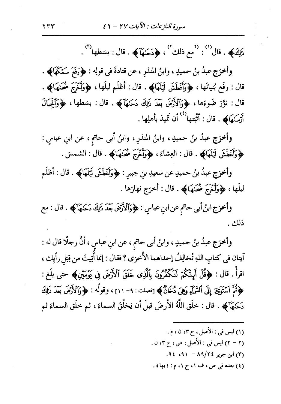 وأخرج عَبد بن حُمَيد ، وَابن المنذر عن قتادة رضي الله عنه في قوله : {رفع سمكها} قال : رفع بنيانها {وأغطش ليلها} قال : أظلم ليلها {وأخرج ضحاها} قال : نور ضوئها {والأرض بعد ذلك دحاها} قال : بسطها {والجبال أرساها} قال : أثبتها بها أن تميد بأهلها.