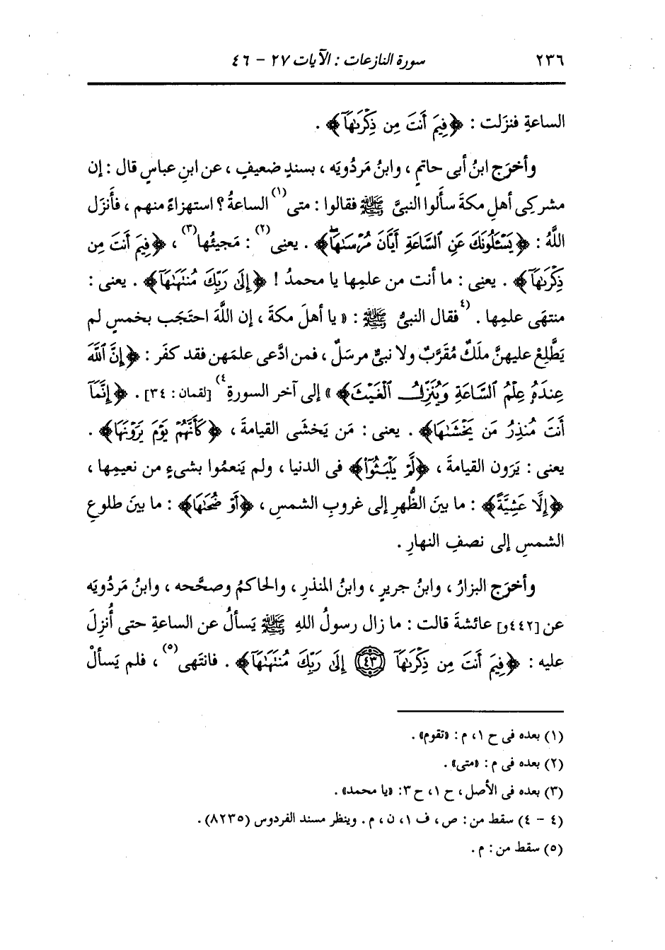وأخرج البزار ، وَابن جَرِير ، وَابن المنذر والحاكم وصححه ، وَابن مردويه عن عائشة قالت : مازال رسول الله صلى الله عليه وسلم يسأل عن الساعة حتى أنزل عليه {فيم أنت من ذكراها إلى ربك منتهاها} فلم يسأل