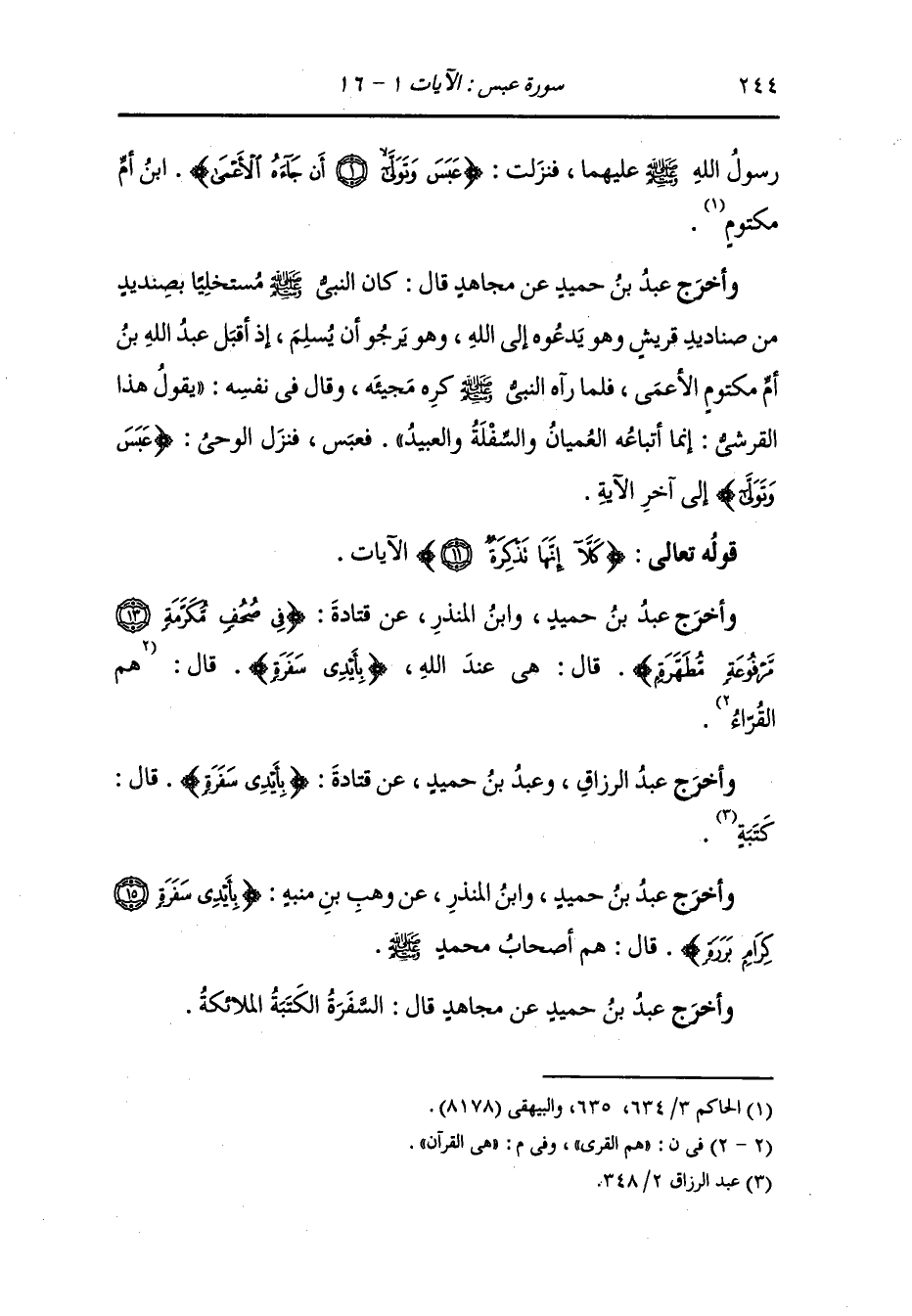 وأخرج عبد الرزاق ، وعَبد بن حُمَيد عن قتادة {بأيدي سفرة} قال : كتبة.