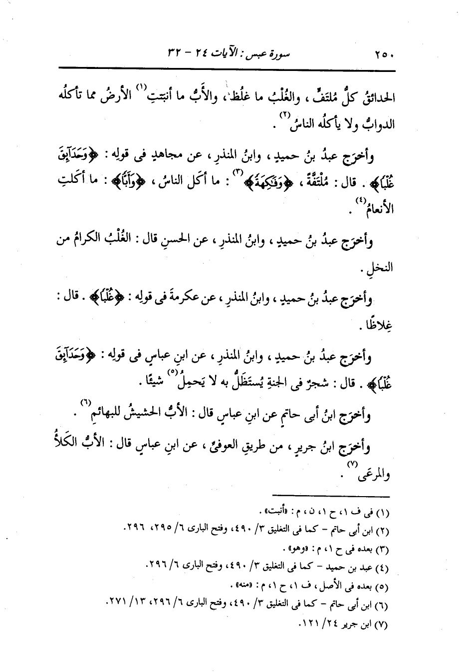 وأخرج عَبد بن حُمَيد ، وَابن المنذر عن مجاهد {وحدائق غلبا} قال : ملتفة {وفاكهة} وهو ما أكل النا س {وأبا} ما أكلت الأنعام.