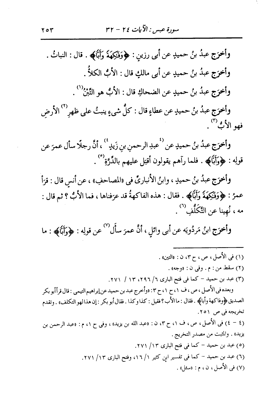 وأخرج عَبد بن حُمَيد عن عبد الرحمن بن يزيد أن رجلا سأل عمر عن قوله : {وأبا} فلما رآهم يقولون أقبل عليهم بالدرة.