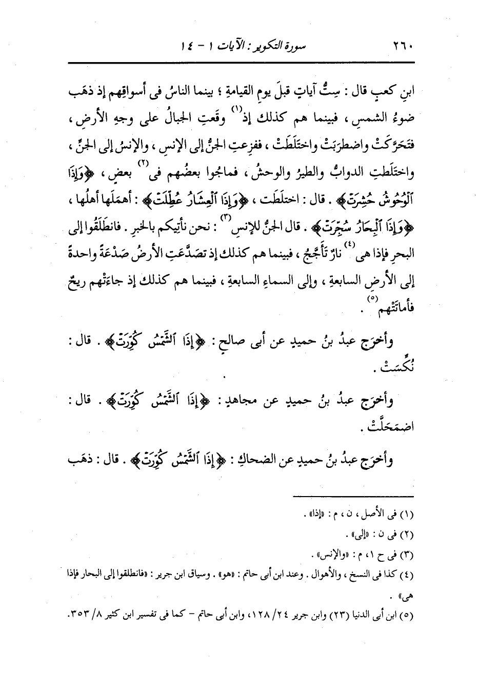 بن كعب قال : ست آيات قبل يوم القيامة بينما الناس في أسواقهم إذ ذهب ضوء الشمس فبينما هم كذلك إذا وقعت الجبال على وجه الأرض فتحركت واضطربت واختلطت ففزعت الجن إلى الإنس والإنس إلى الجن واختلطت الدواب والطير والوحش فماجوا بعضهم في بعض {وإذا الوحوش حشرت} قال : اختلطت {وإذا العشار عطلت} أهملها أهلها {وإذا البحار سجرت} قال : الجن والإنس نحن نأتيكم بالخبر فانطلقوا إلى البحر فإذا هي نار تأجج فبينما هم كذلك إذا انصدعت الأرض صدعة واحدة إلى الأرض السابعة وإلى السماء السابعة فبينما هم كذلك إذ جاءتهم ريح فأماتتهم.